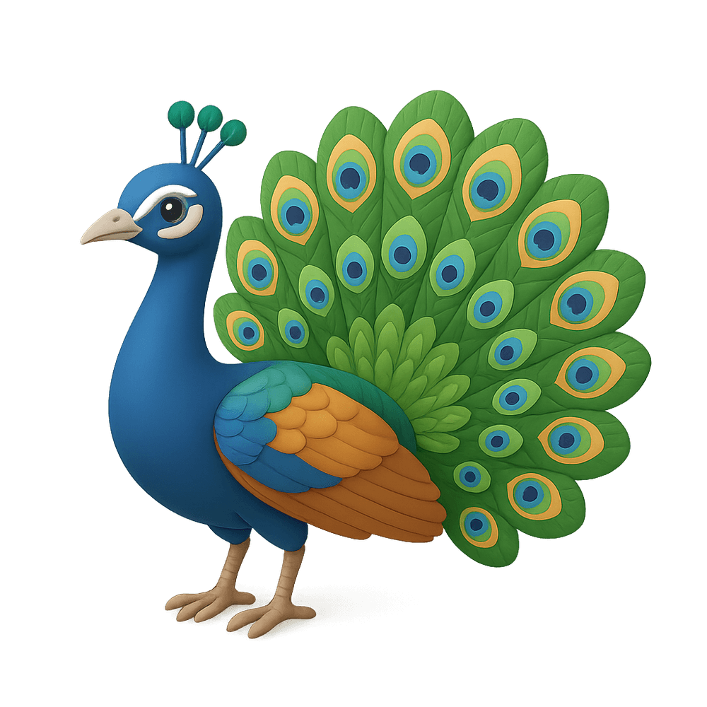 The Indian Peafowl, also known as the peacock, is a large, colorful bird native to the Indian subcontinent. Famous for the male's iridescent blue and green plumage and spectacular tail display, it is a symbol of beauty and grace in many cultures.