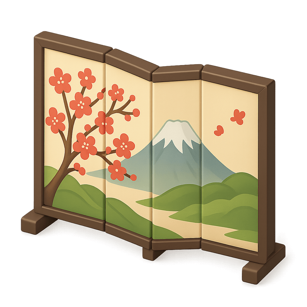 A Japanese folding screen, known as 'byōbu,' is a decorative and functional piece of furniture traditionally used to divide spaces and display art. These screens often feature intricate paintings or calligraphy and reflect Japanese aesthetics and cultural heritage.