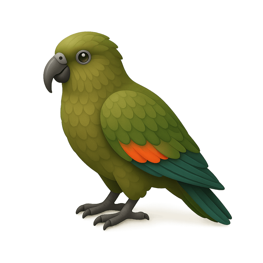 The Kea Parrot is a highly intelligent and playful alpine parrot native to New Zealand, known for its curiosity and problem-solving skills. It inhabits mountainous regions and is recognized for its olive-green plumage and bright orange underwings.