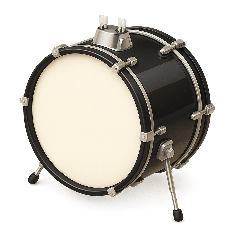 A kick drum is a large percussion instrument that produces a deep, low-pitched sound when struck. Commonly used in drum kits for music production and live performances, it provides the rhythmic foundation in many genres, especially in rock, pop, and electronic music.