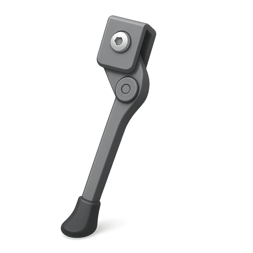 A kickstand is a simple metal or plastic support attached to a bicycle or motorcycle, allowing it to stand upright when not in use. It is typically mounted near the rear wheel and can be easily deployed or retracted with a foot. Kickstands are essential for parking two-wheeled vehicles securely without needing to lean them against another object.