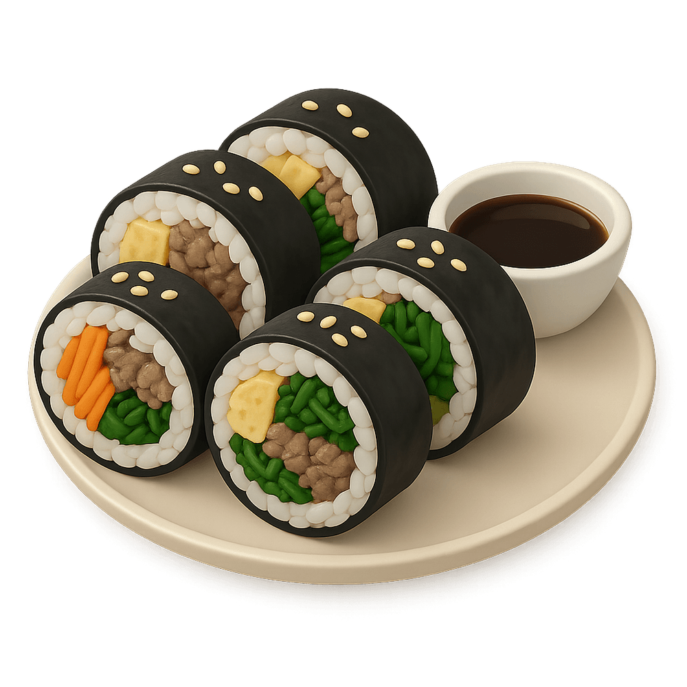 Kimbap is a popular Korean dish made of steamed white rice and various fillings such as vegetables, meat, or fish, rolled in seaweed and sliced into bite-sized pieces. It is often enjoyed as a snack, picnic food, or light meal.