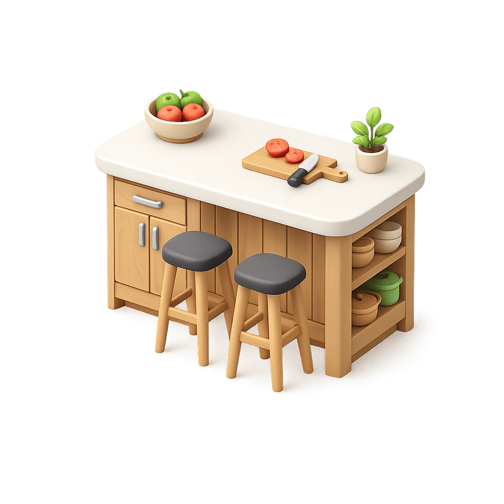 A kitchen island is a freestanding counter or workspace located in the center of a kitchen. It provides additional surface area for food preparation, storage, and seating, enhancing both functionality and social interaction in the kitchen.