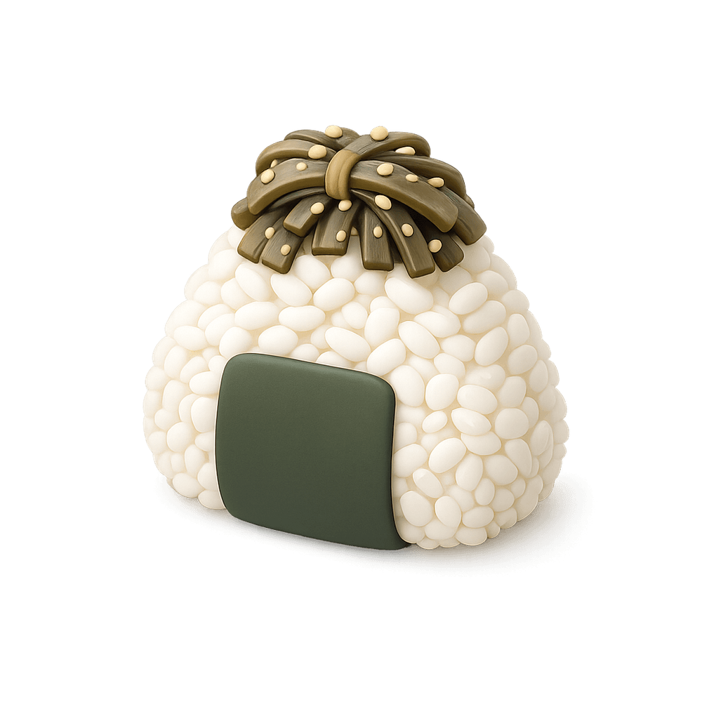 Kombu Onigiri is a Japanese rice ball snack, typically filled or topped with seasoned kelp (kombu). It is a popular and convenient food item enjoyed for its savory flavor and portability.