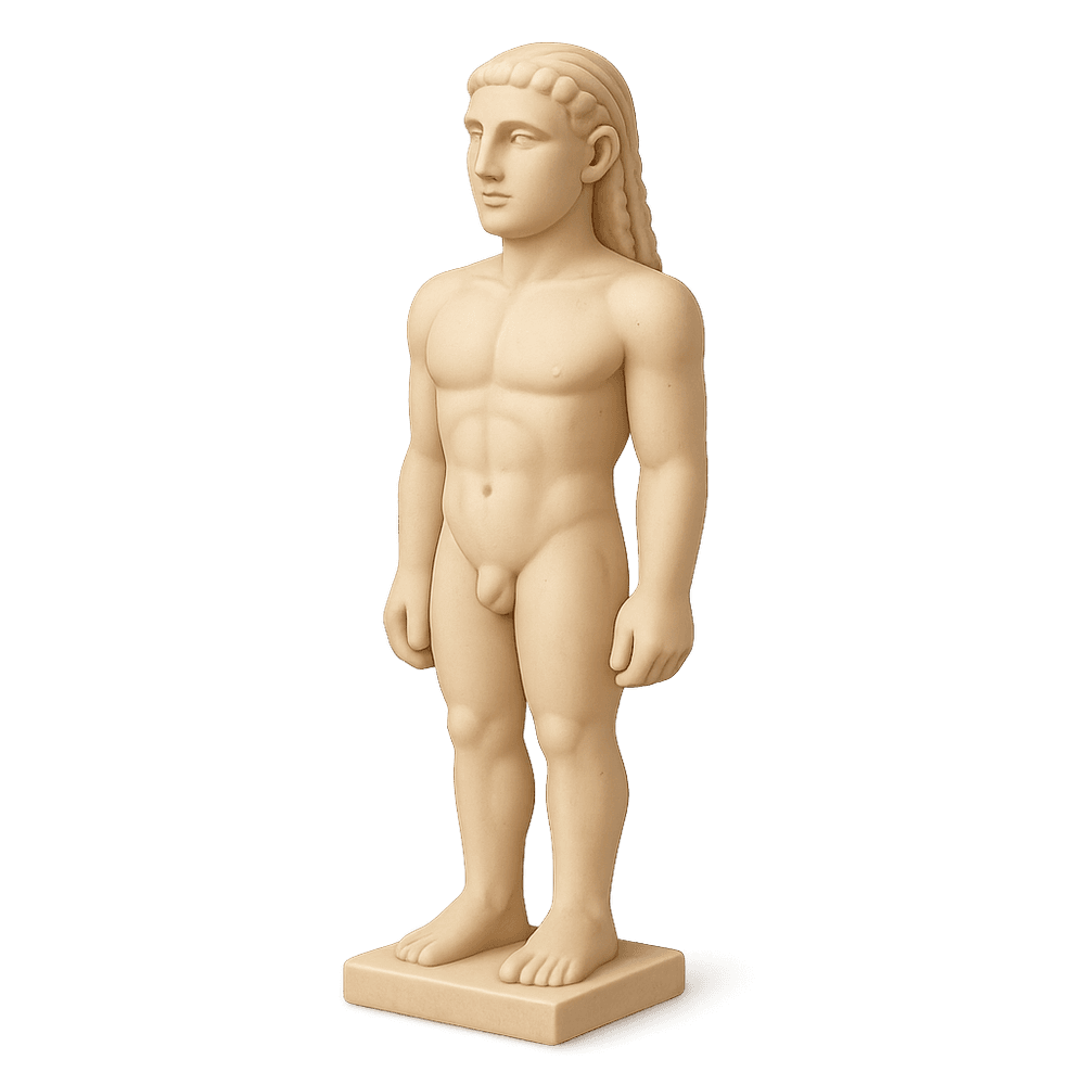 A Kouros is an ancient Greek statue representing a young male, typically standing nude and used as a grave marker or offering in sanctuaries. These sculptures are significant examples of early Greek art and reflect the ideals of youth, beauty, and athleticism in ancient Greek culture.