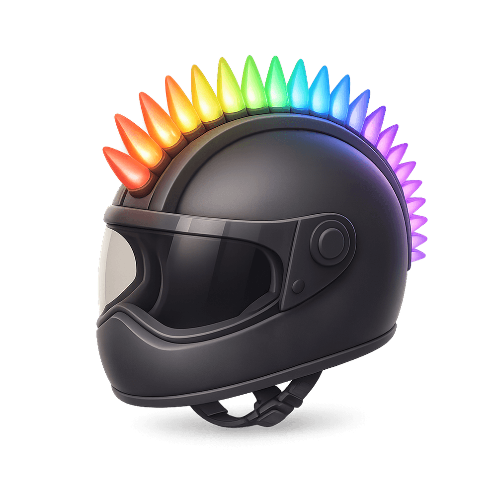 A bold and futuristic helmet featuring a mohawk design illuminated with vibrant LED lights. Popular at festivals, parties, and performances, it combines fashion with technology for a striking visual effect.