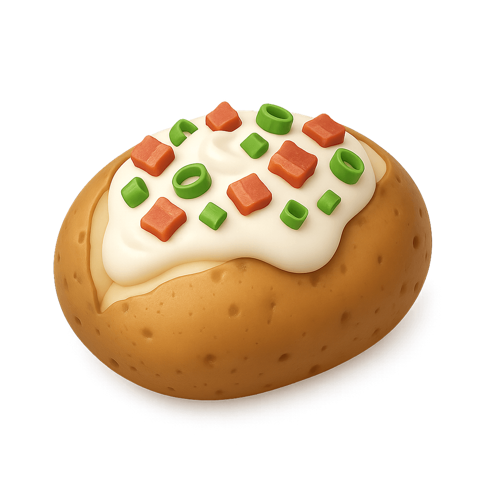 A hearty baked potato topped with cheese, bacon, sour cream, and chives, offering a savory and satisfying comfort food experience. Popular as a side dish or a meal on its own.