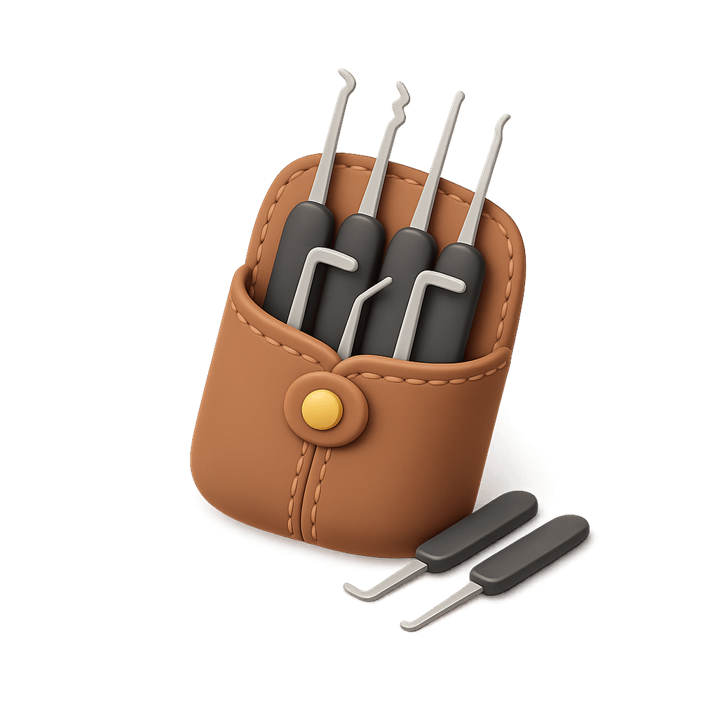 A lockpick set is a collection of specialized tools used for unlocking locks without using the original key. Popular among hobbyists for lockpicking as a skill or puzzle, these sets typically include picks, tension wrenches, and rakes. Lockpicking is often practiced as a recreational challenge or for educational purposes.
