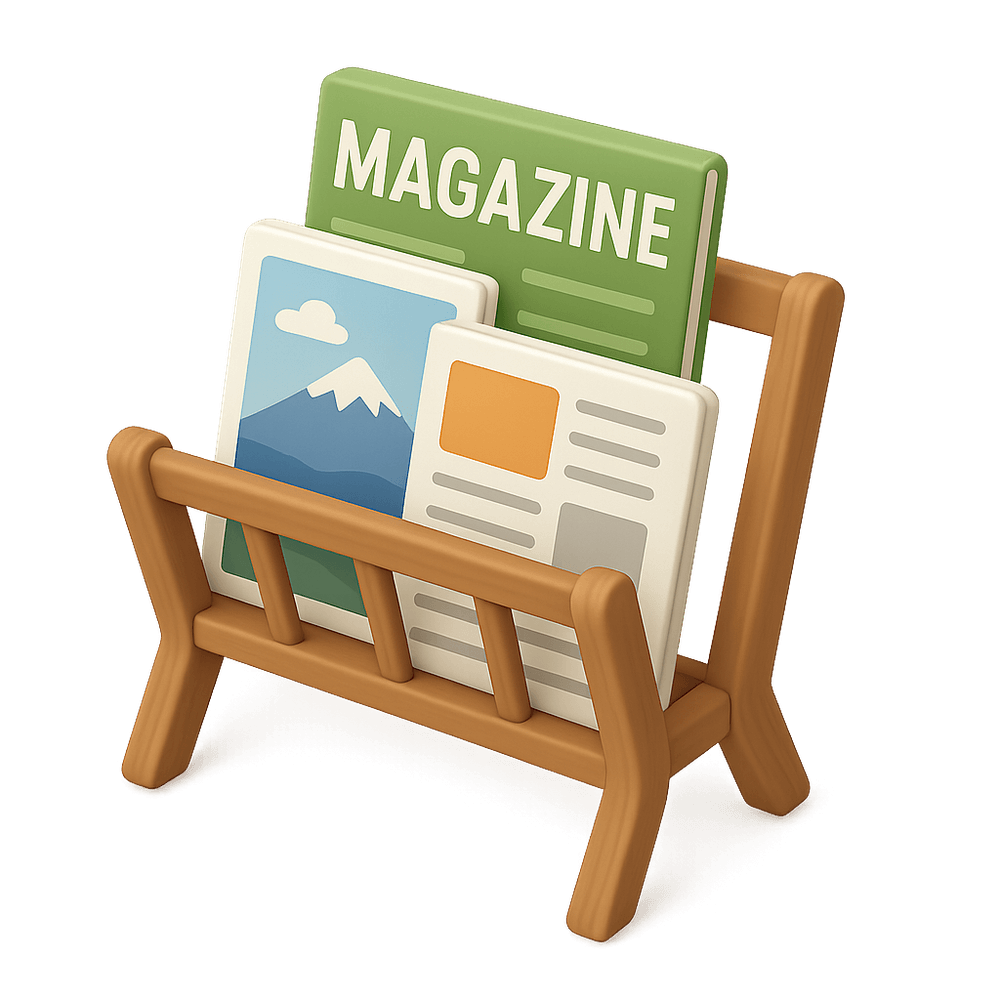 A magazine rack is a household item designed to neatly store and organize magazines, newspapers, or other reading materials. It helps keep living spaces tidy and provides easy access to periodicals.