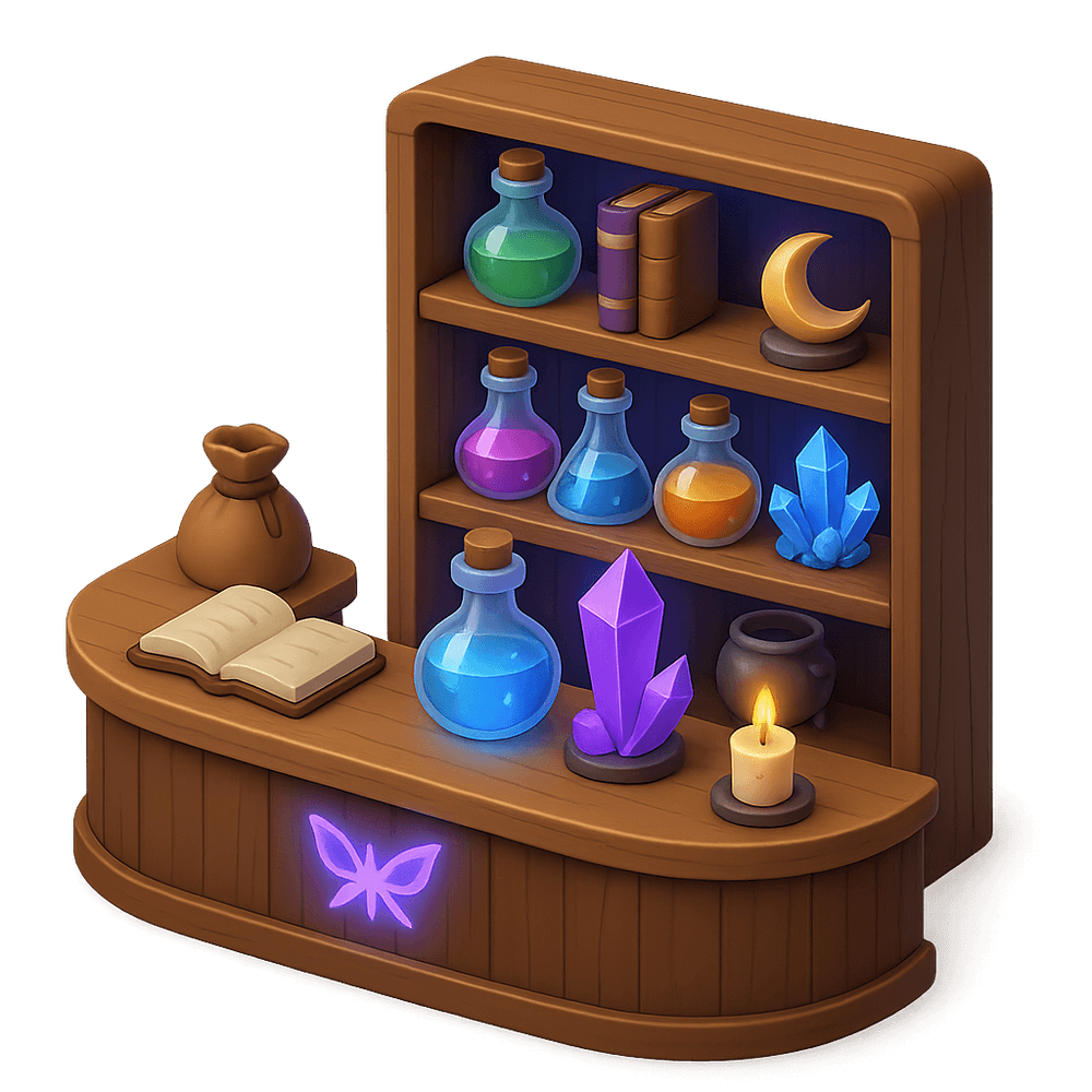 A whimsical store filled with enchanted items, potions, and mysterious artifacts, catering to adventurers and magic users in a fantastical world.