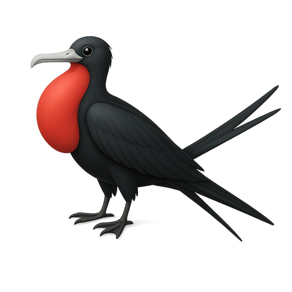 The Magnificent Frigatebird is a large, striking seabird known for its long wings, forked tail, and the male's distinctive red throat pouch, which inflates during courtship displays. It is found in tropical and subtropical oceans, often soaring effortlessly above the sea.