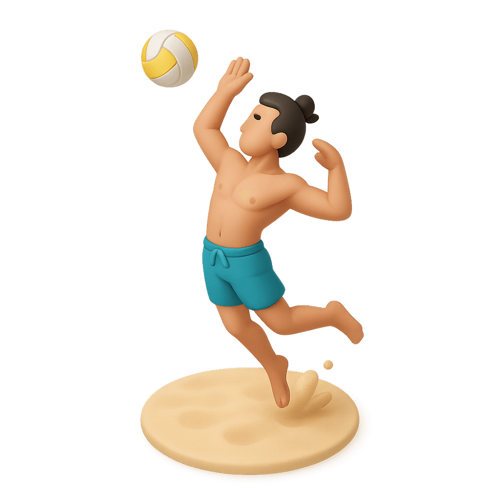 A man performing a powerful smash move in a beach volleyball game, showcasing athleticism and skill in an outdoor sandy setting.