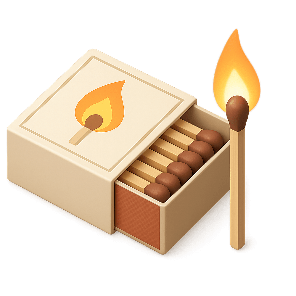 A match is a small stick coated with a chemical substance that ignites when struck against a suitable surface, producing a flame. It is commonly used to light candles, stoves, or fires in everyday life.