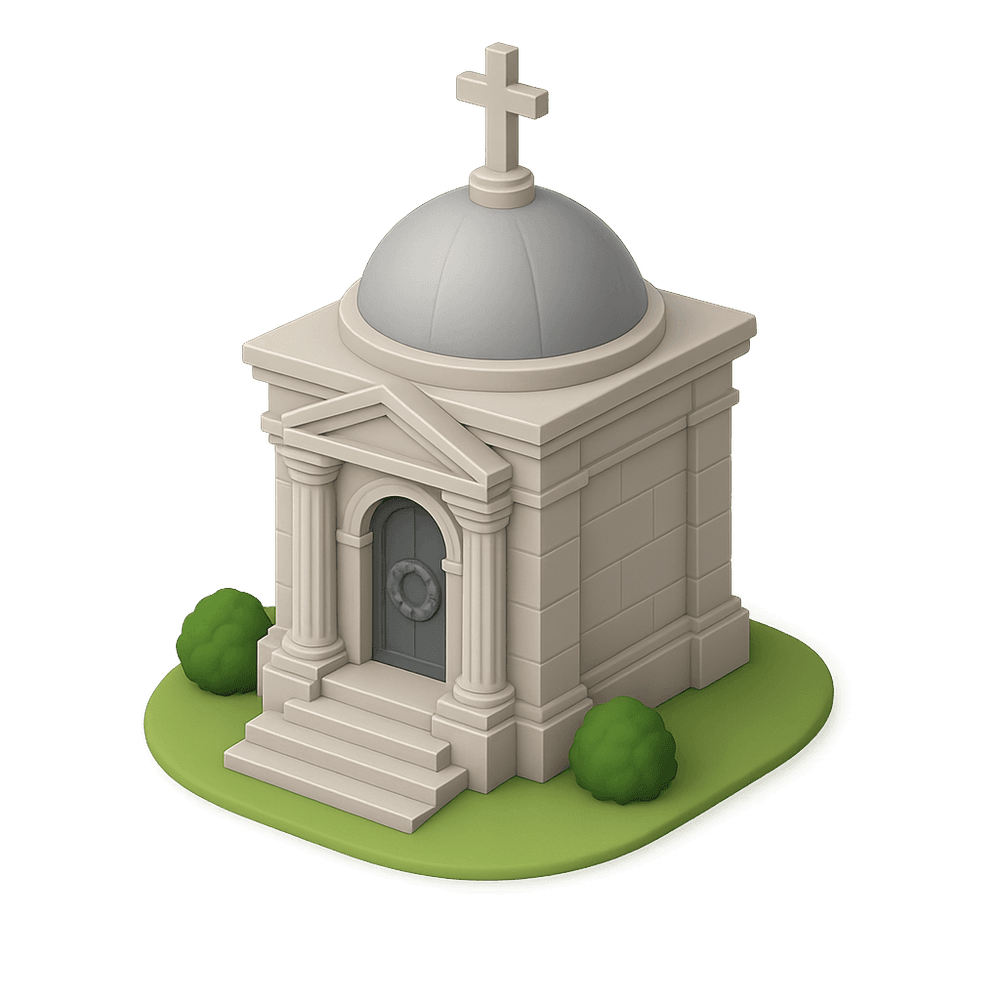 A mausoleum is a large, stately structure built as a monument and tomb to house the remains of one or more deceased individuals, often of historical or cultural significance.