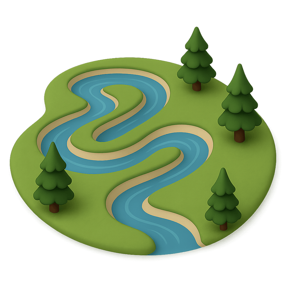 A meander is a winding curve or bend in a river or stream, formed as water erodes the outer banks and deposits sediment on the inner banks. Meanders are characteristic features of mature river systems and contribute to the dynamic landscape of river valleys.