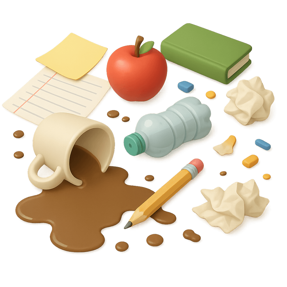 A mess is a state of disorder or untidiness, often found in everyday environments such as homes, offices, or public spaces. It typically involves scattered objects, spills, or clutter that disrupts organization and cleanliness.