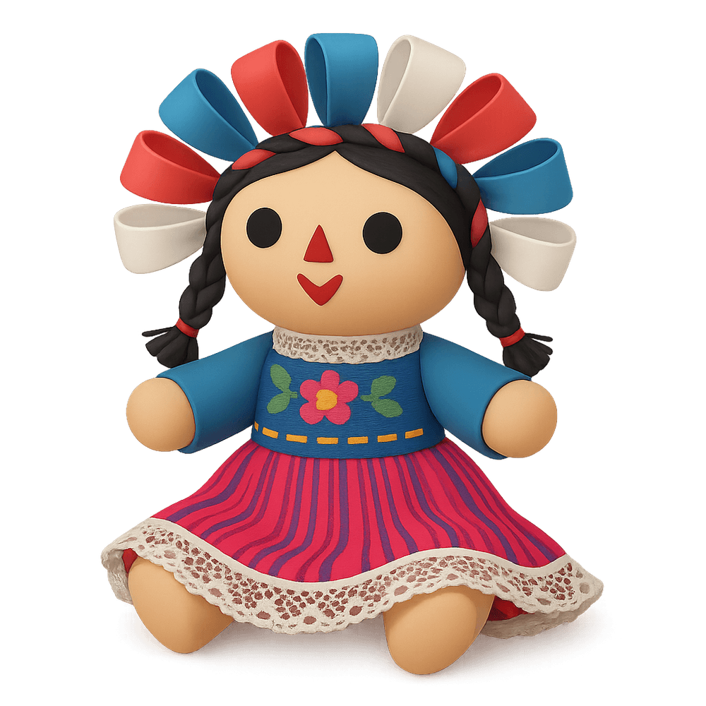 A Mexican Rag Doll is a traditional handcrafted doll, often made from colorful fabrics and ribbons, representing Mexican heritage and culture. These dolls are popular folk art items and are commonly given as gifts or souvenirs.
