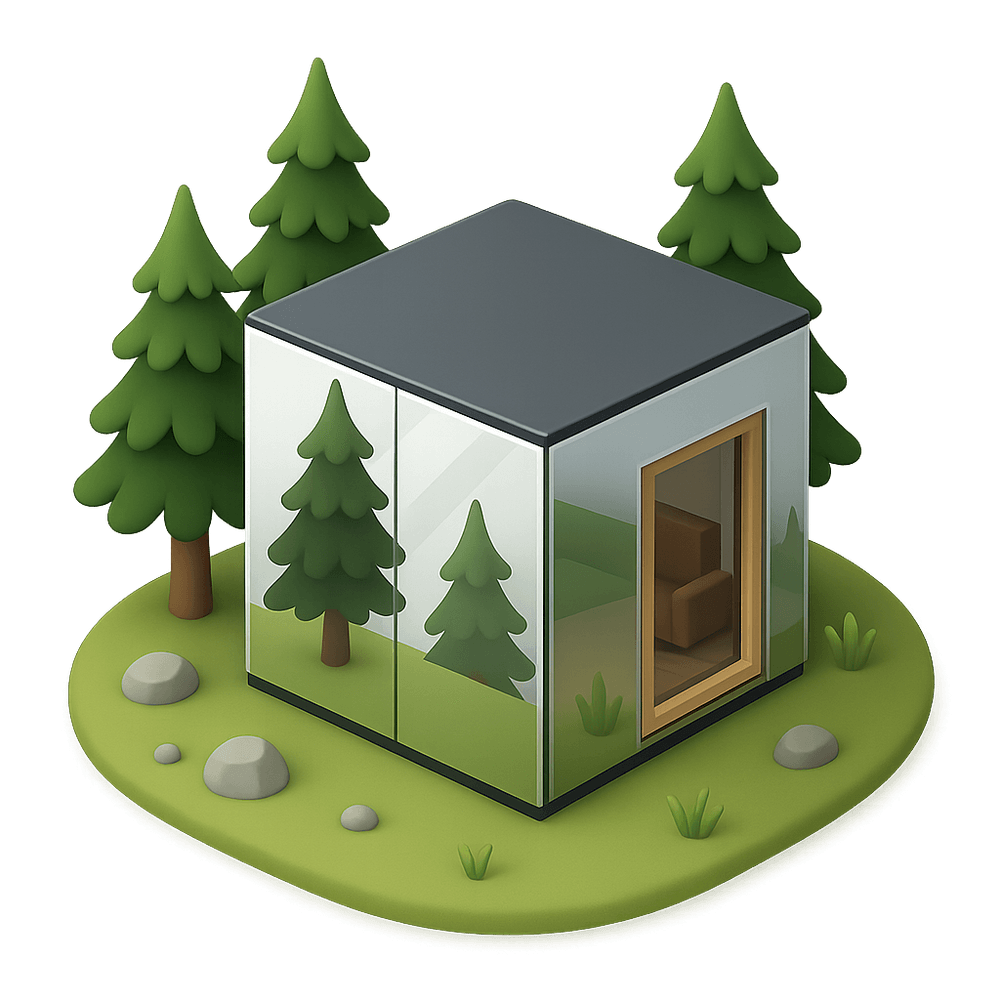 A compact, modern cabin with mirrored exterior walls that blend seamlessly into the surrounding landscape, offering privacy and a unique architectural experience. The reflective surfaces create an illusion of invisibility, making the structure both a striking retreat and a work of art.