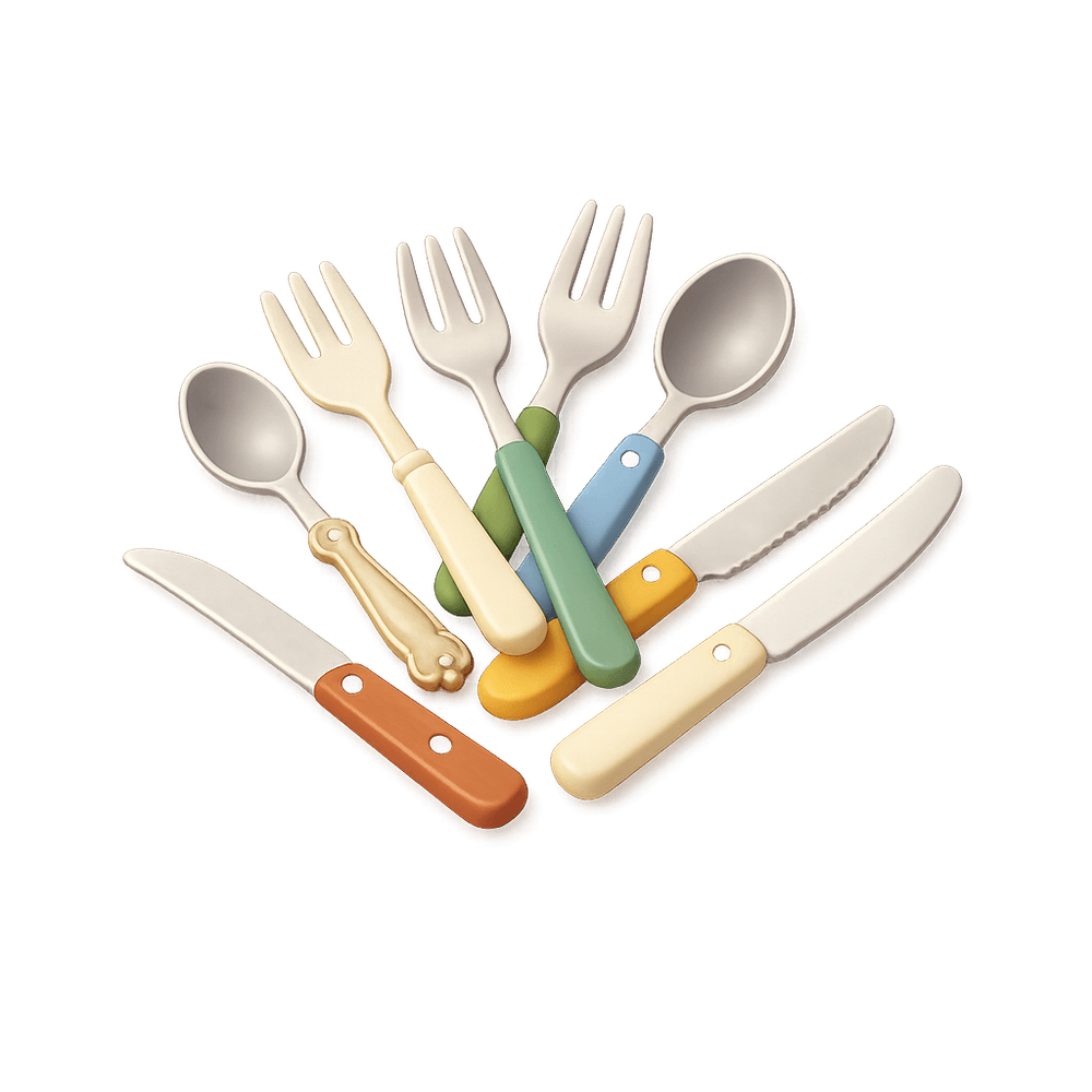 A collection of forks, knives, and spoons that do not match in style, size, or design, often gathered over time or from different sets. Commonly found in households, they add a quirky, practical touch to everyday dining.