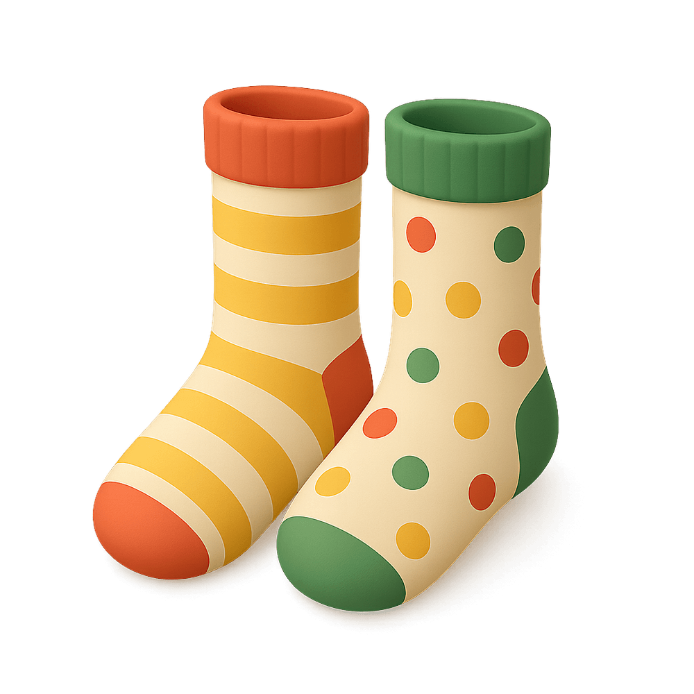 A pair of socks that do not match in color, pattern, or style, often worn unintentionally or as a quirky fashion statement. Mismatched socks are a common occurrence in everyday life, symbolizing individuality, spontaneity, or simply laundry mishaps.