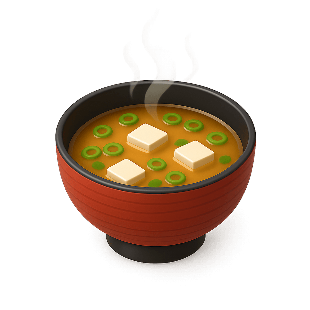 A traditional Japanese soup made with a base of dashi broth and miso paste, often containing tofu, seaweed, and green onions. Commonly served as a starter or side dish in Japanese cuisine.