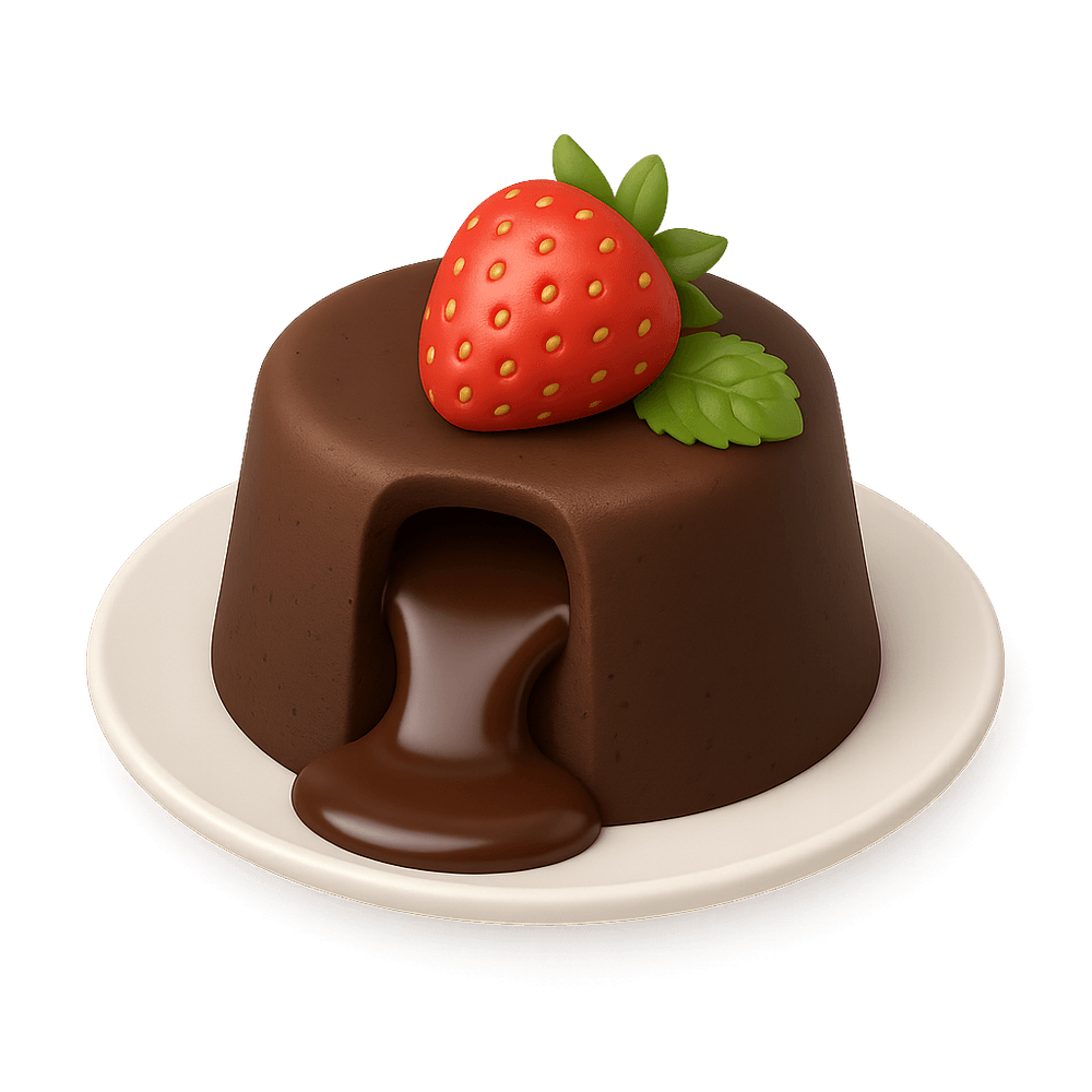 A rich, individual chocolate cake with a gooey molten center, often served warm and topped with ice cream or fruit. A decadent dessert popular in restaurants and for special occasions.