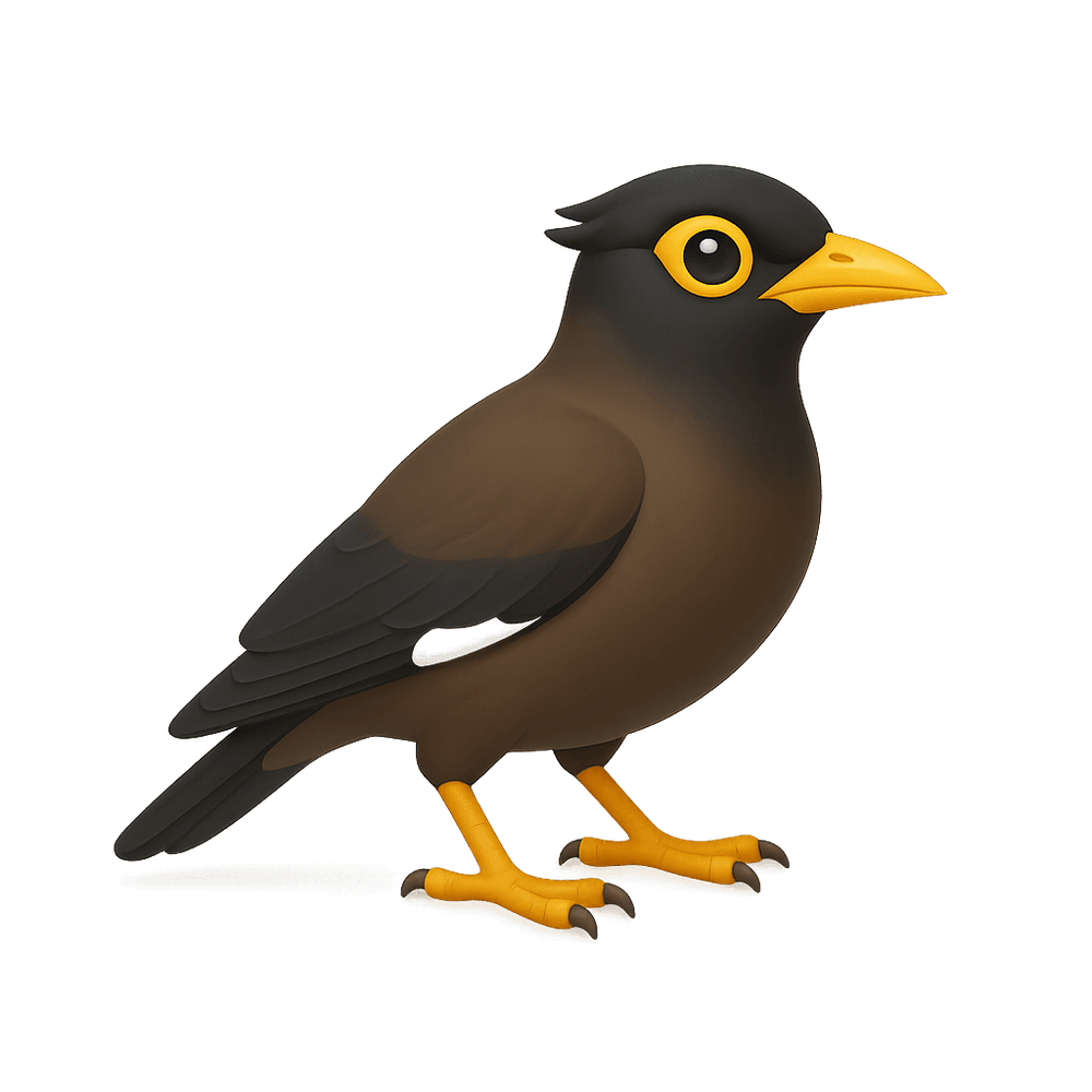 The myna is a medium-sized, highly vocal bird known for its intelligence and ability to mimic human speech. Native to Asia, mynas are often found in urban and rural environments and are recognized for their glossy plumage and social behavior.