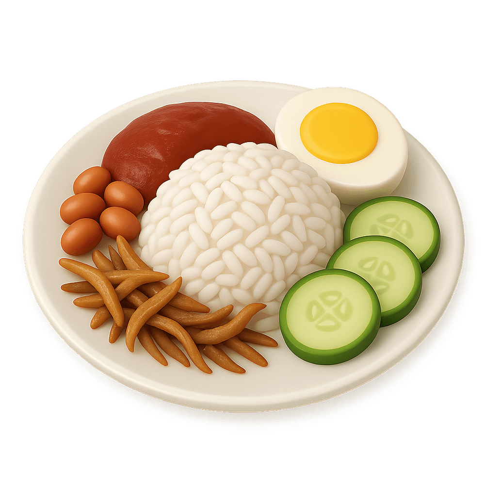 Nasi Lemak is a traditional Malaysian dish featuring fragrant rice cooked in coconut milk, served with sambal, fried crispy anchovies, roasted peanuts, boiled egg, and cucumber. It is a beloved staple often enjoyed for breakfast or lunch and is considered Malaysia's national dish.