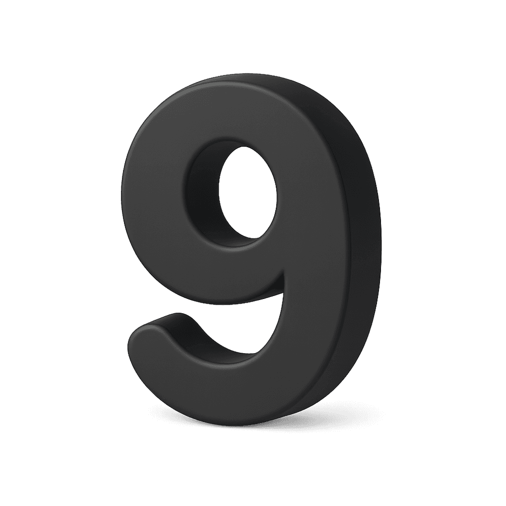 A graphical or typographic representation of the number 9, commonly used in digital interfaces, signage, and symbolic systems to denote quantity, order, or identification.