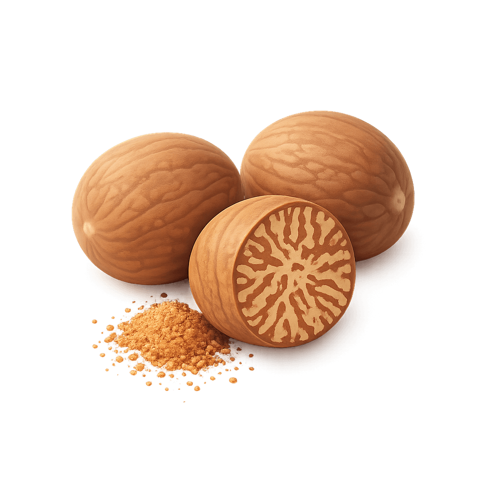 Nutmeg is a warm, aromatic spice made from the seed of the Myristica fragrans tree, commonly used in sweet and savory dishes around the world.