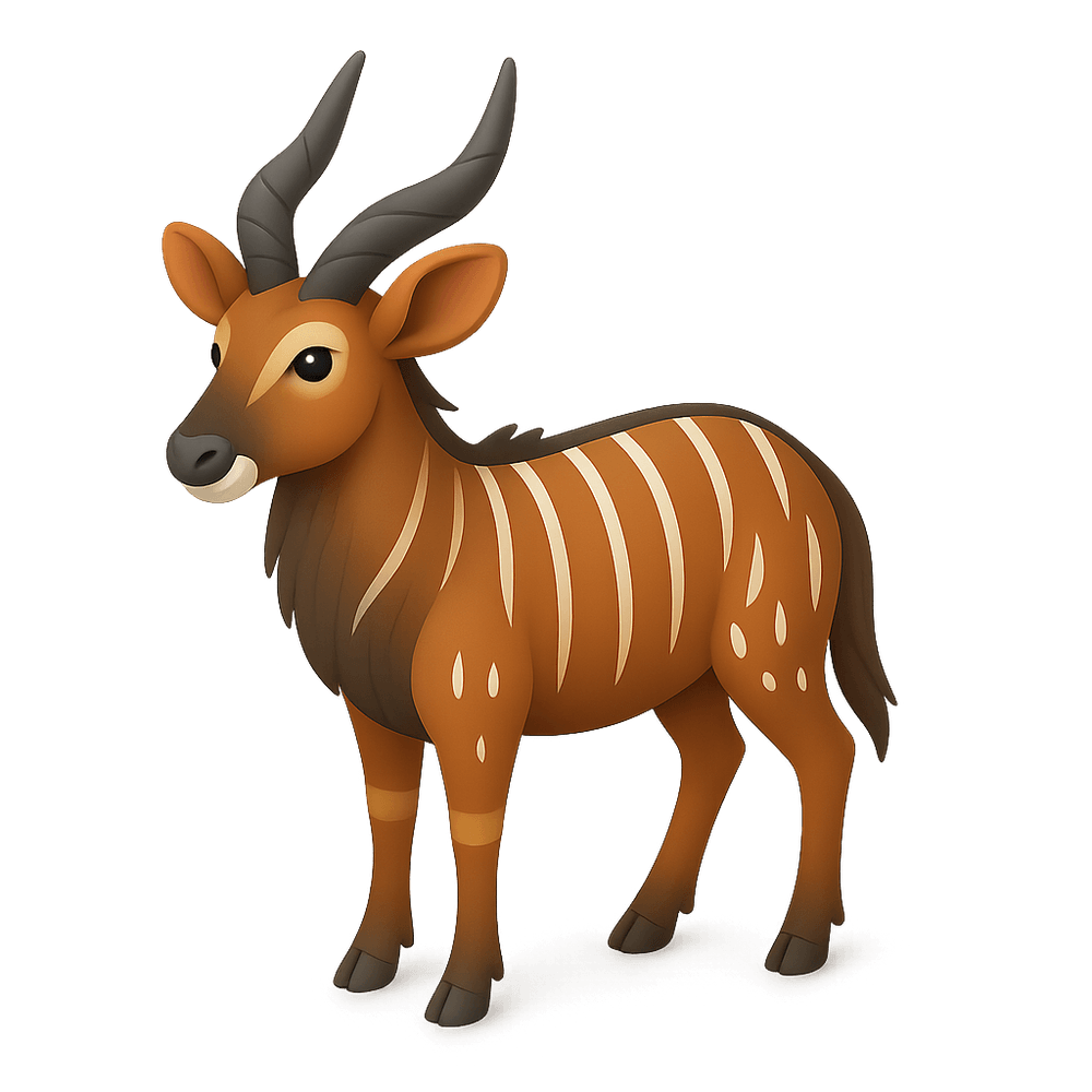 The Nyala is a spiral-horned antelope native to southern Africa, known for its striking white stripes and spots on a reddish-brown or slate-gray coat. Males are larger and have impressive twisted horns, while females are smaller and hornless. Nyalas inhabit woodlands and thickets, and are known for their shy, elusive behavior.