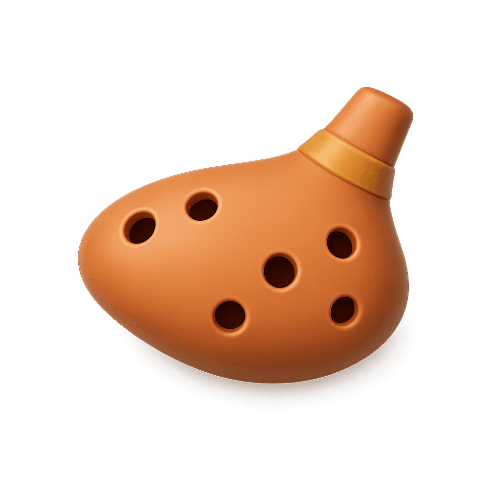 A small, handheld wind instrument, traditionally made of ceramic or clay, that produces melodic sounds when blown into. Popular in folk music and as a hobbyist's instrument, the ocarina is known for its simple design and soothing tones.