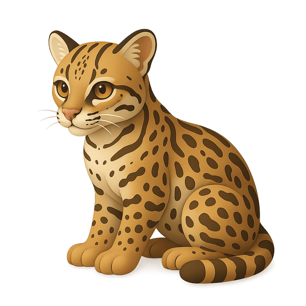 The ocelot is a medium-sized wild cat native to the forests and grasslands of Central and South America. Known for its striking golden-yellow coat marked with black rosettes and stripes, the ocelot is a nocturnal predator that hunts small mammals, birds, and reptiles. Its agility and keen senses make it an effective hunter in dense vegetation.