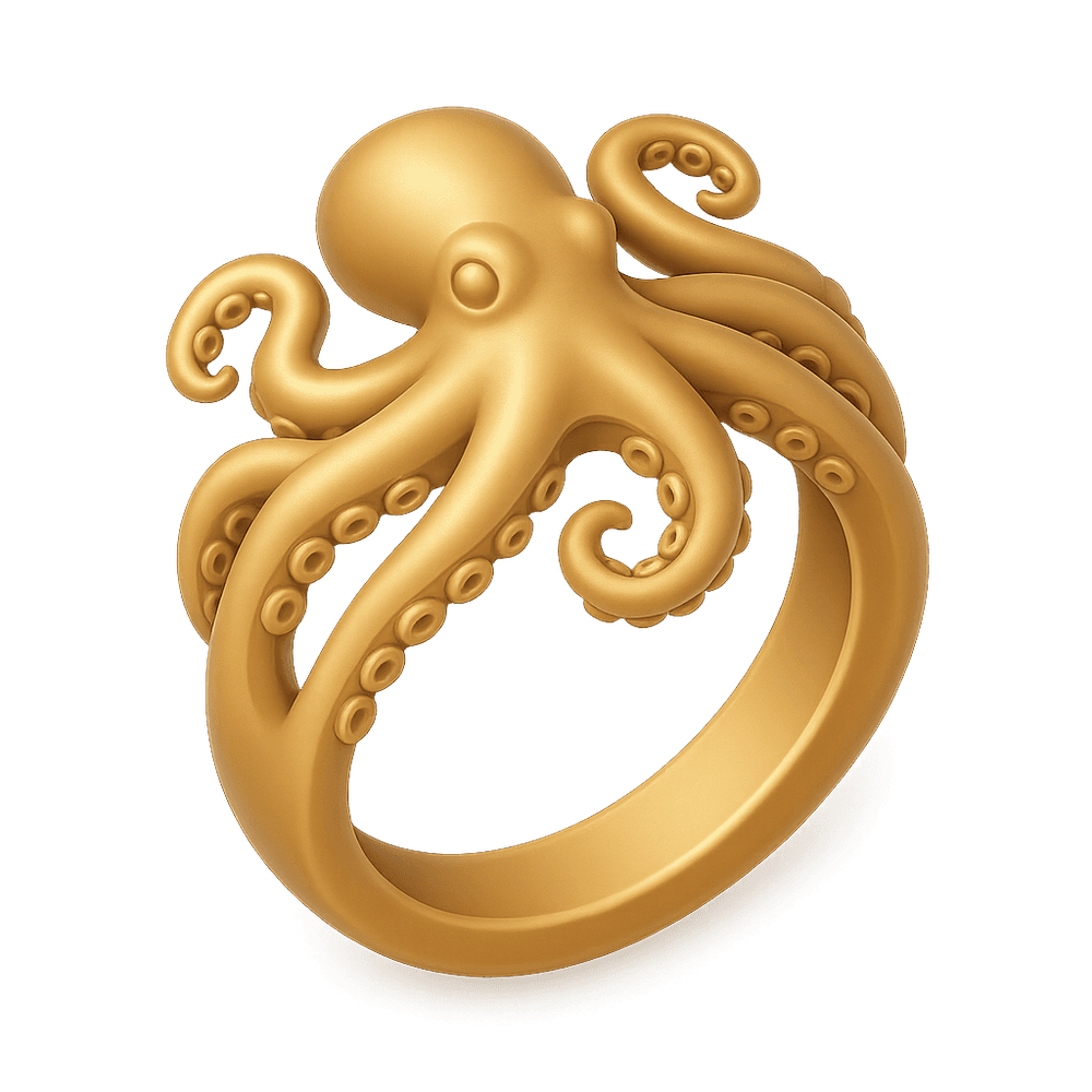 A unique ring designed in the shape of an octopus, featuring intricate tentacle details. This statement jewelry piece adds a touch of ocean-inspired style to any outfit.