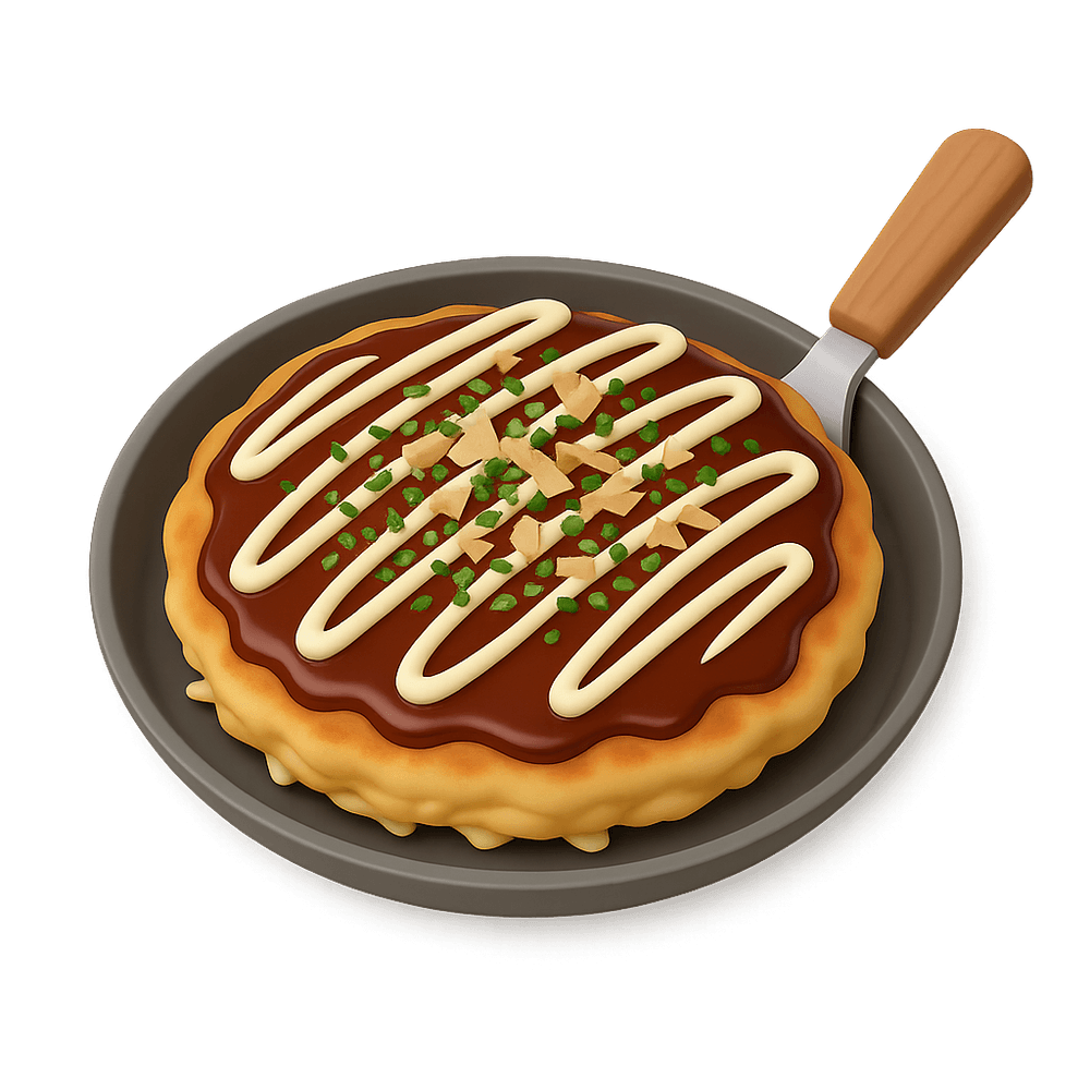 Okonomiyaki is a savory Japanese pancake made with a batter of flour, eggs, shredded cabbage, and a variety of ingredients such as meat, seafood, and vegetables, cooked on a griddle and topped with sauces and condiments.