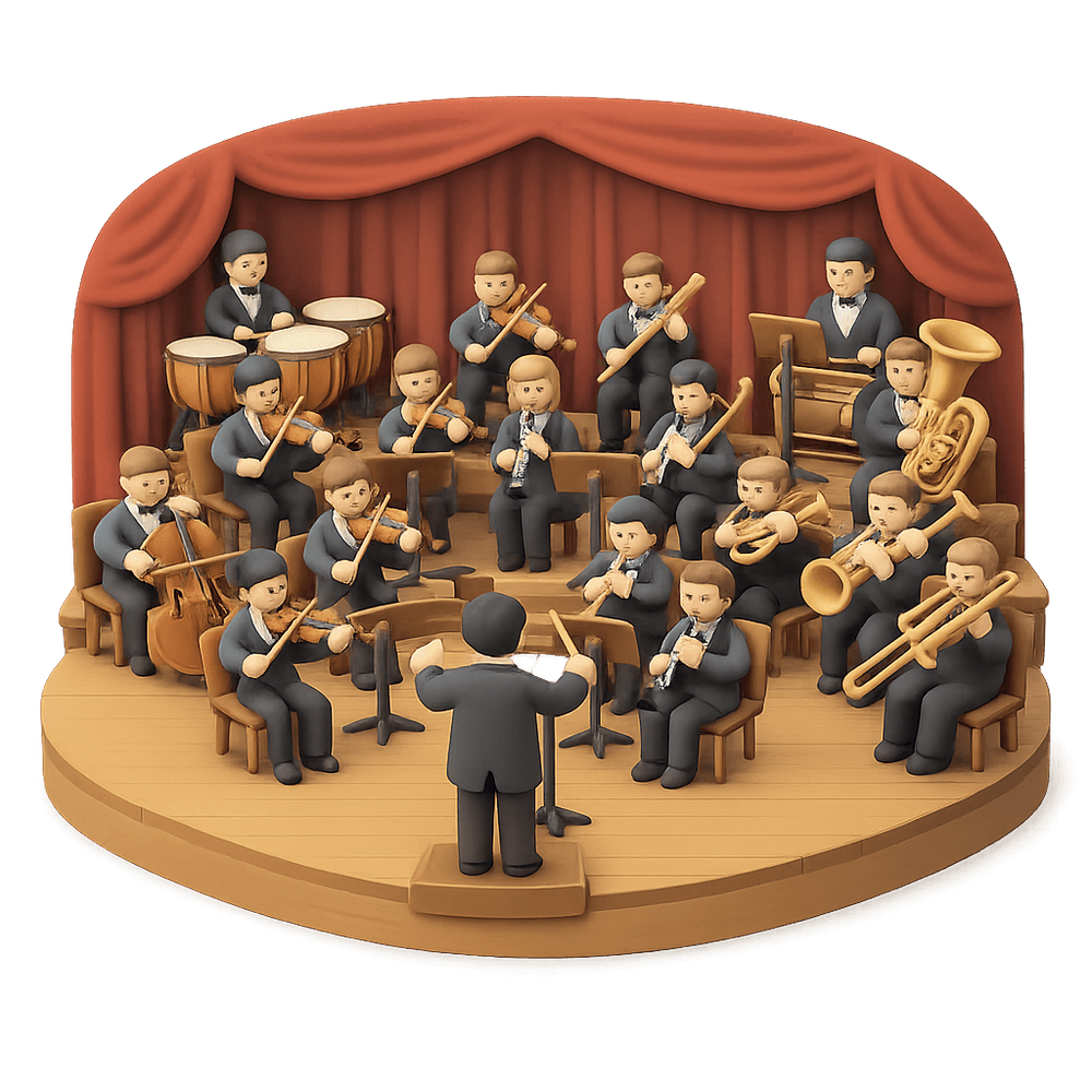 A large group of musicians who perform together, typically featuring string, woodwind, brass, and percussion instruments, and often led by a conductor. Orchestras are known for performing classical music and large-scale musical works in concert halls.
