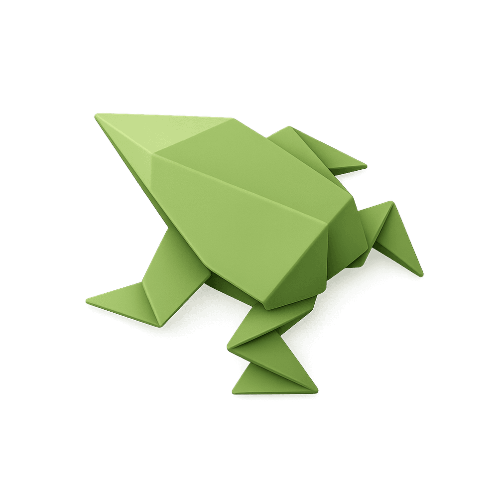 A paper frog created through the Japanese art of origami. This hobby involves folding a single sheet of paper into a frog shape, often designed to hop when pressed. It is a fun and creative craft enjoyed by people of all ages.