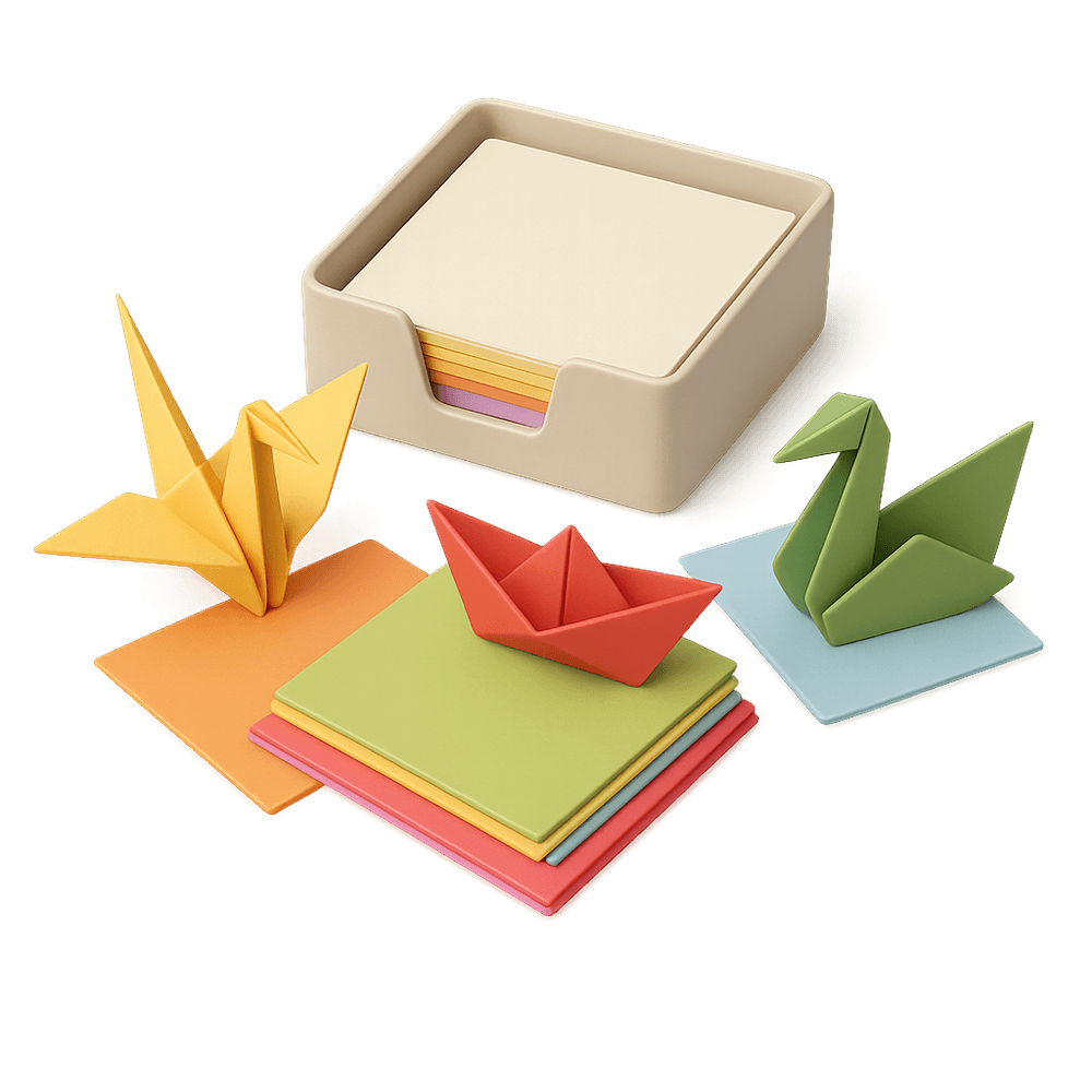 A collection of colorful, square sheets of paper specifically designed for the art of origami. This set often includes instructions for folding various traditional and modern designs, making it perfect for beginners and experienced paper folders alike.