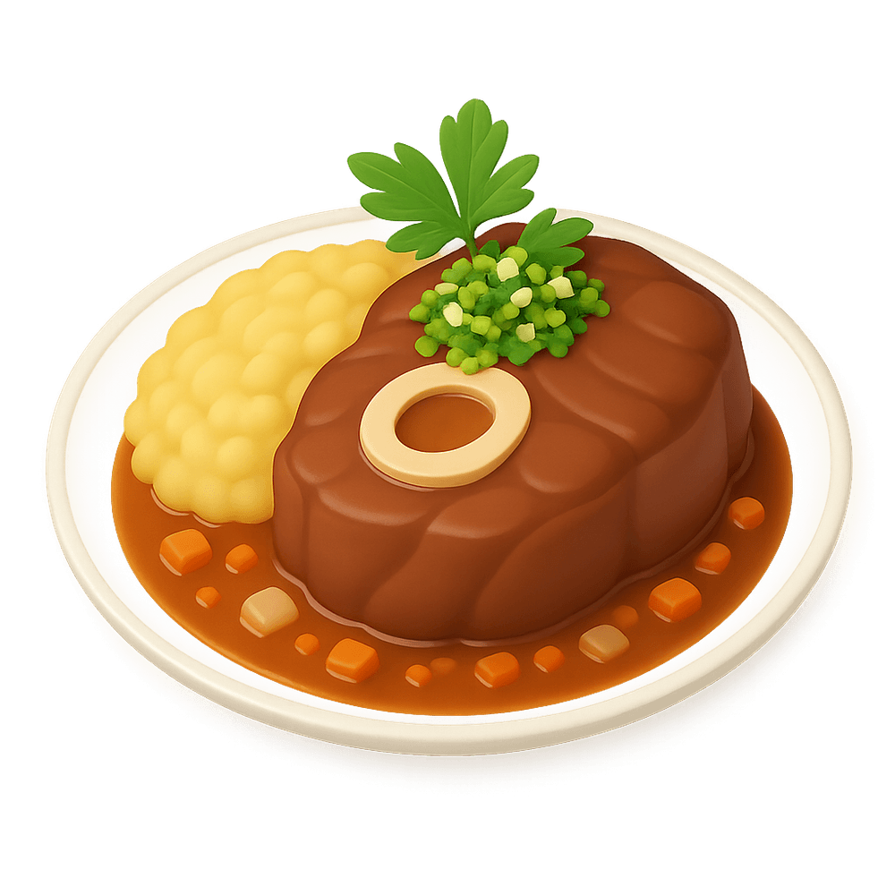 Ossobuco is a traditional Italian dish made with braised veal shanks, slow-cooked with vegetables, white wine, and broth. Known for its rich flavor and tender meat, it is often served with gremolata and risotto or polenta.