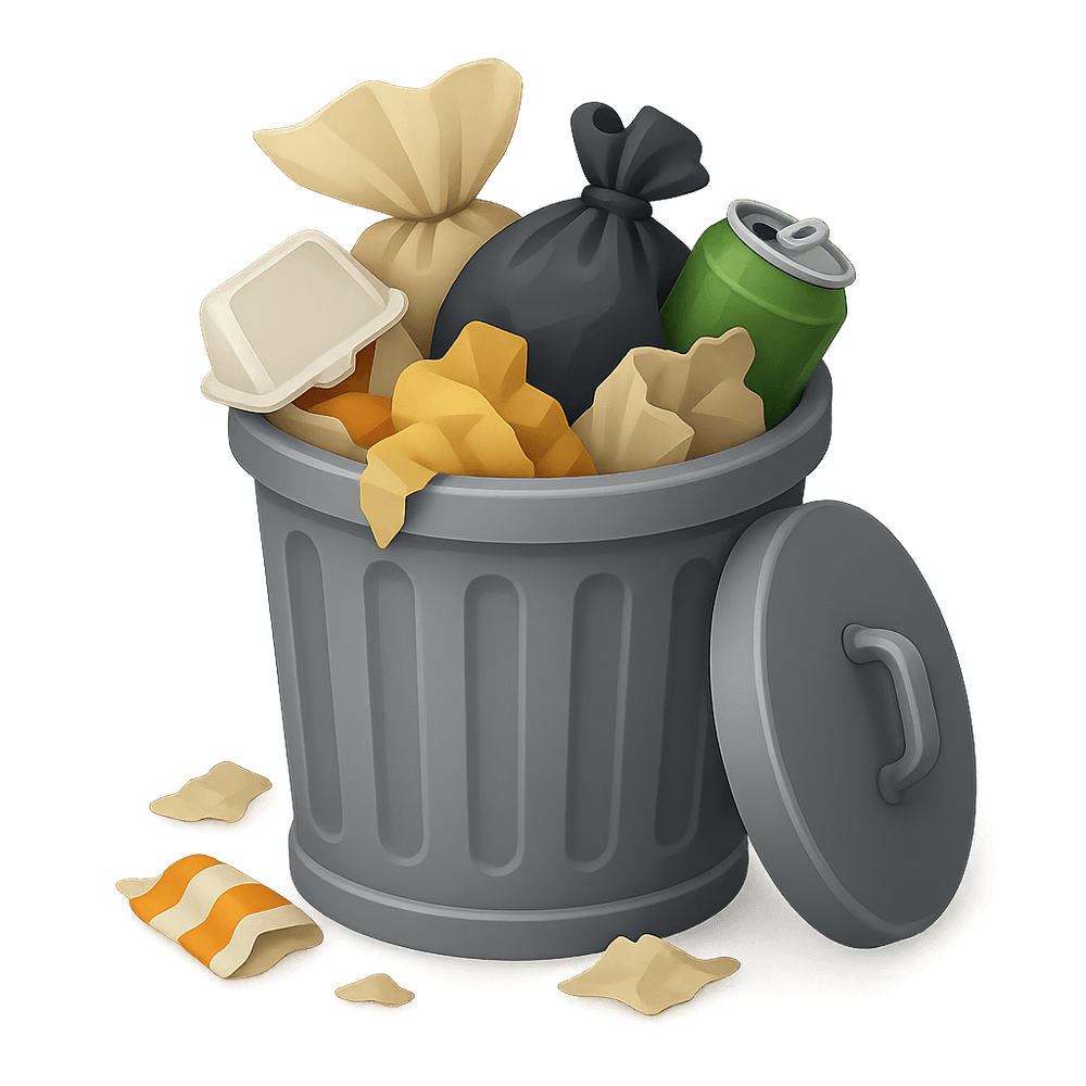 A trash can that is filled beyond its capacity, often resulting in overflowing garbage and a messy appearance. Commonly seen in busy households, offices, or public spaces, it signals the need for waste removal and better organization.