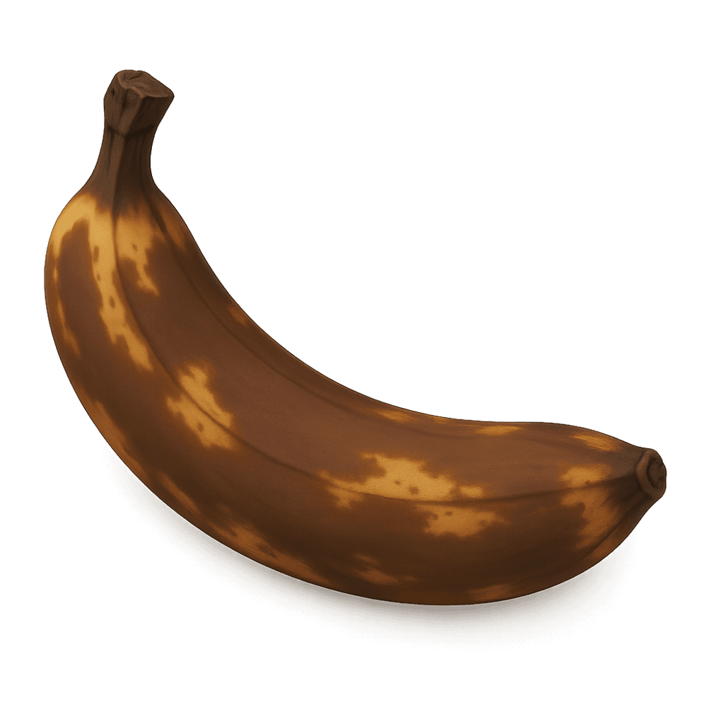 A banana that has become soft, brown, and sweet due to overripening. Often used in baking or smoothies, it is a common sight in many households.