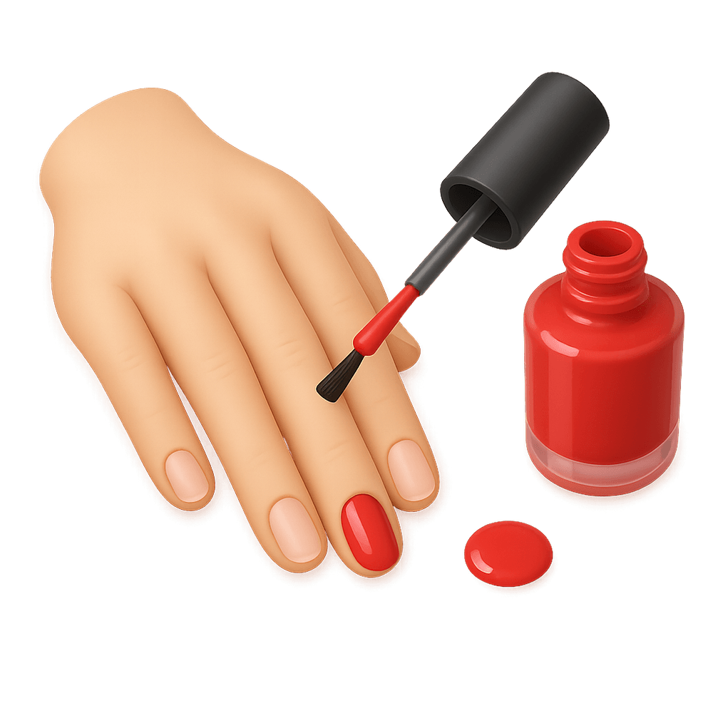 The act of applying colored polish or decorative designs to fingernails or toenails, often as a form of self-expression or personal grooming. Commonly associated with beauty routines and fashion trends.