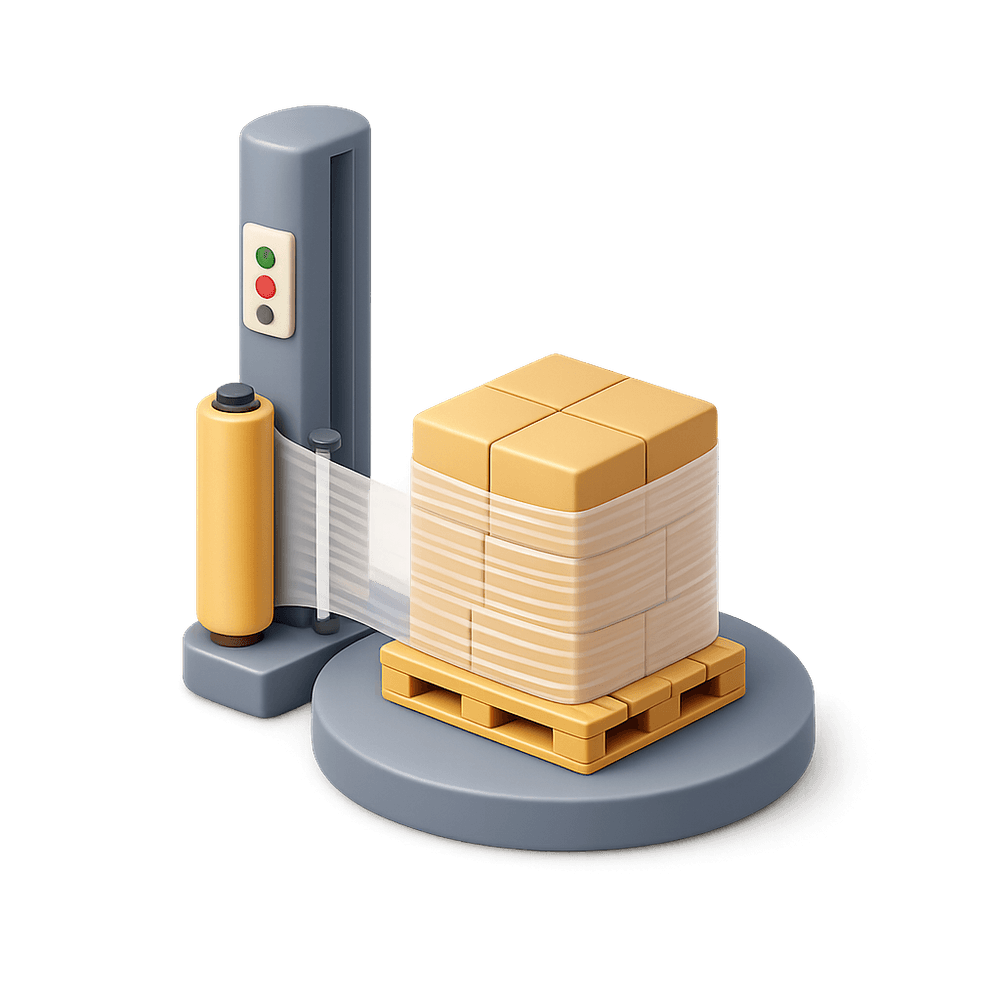 A pallet wrapper is an industrial machine used to securely wrap pallets of goods with stretch film, stabilizing and protecting them for storage or transport. Commonly found in warehouses and shipping facilities, it increases efficiency and safety in packaging operations.