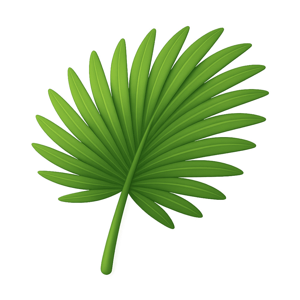 A palm frond is a large, green, fan-shaped or feather-like leaf from a palm tree, commonly found in tropical and subtropical regions. It is often used for shade, decoration, or traditional crafts.