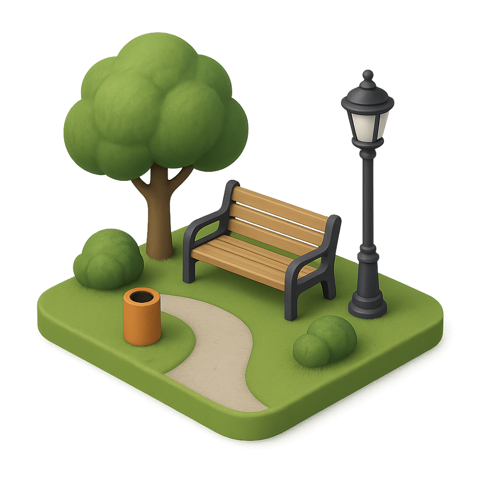 A public outdoor area with grass, trees, and recreational facilities, designed for relaxation, play, and community gatherings. Parks are commonly found in urban and suburban areas and serve as green spaces for people to enjoy nature and outdoor activities.