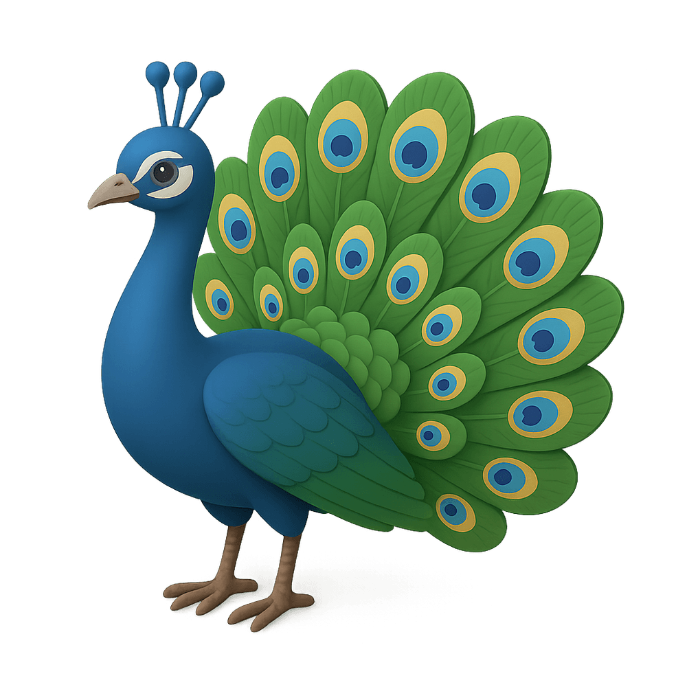 A large, colorful bird known for its iridescent tail feathers, which it fans out in a spectacular display. Native to South Asia, the peacock is often associated with beauty and courtship rituals.