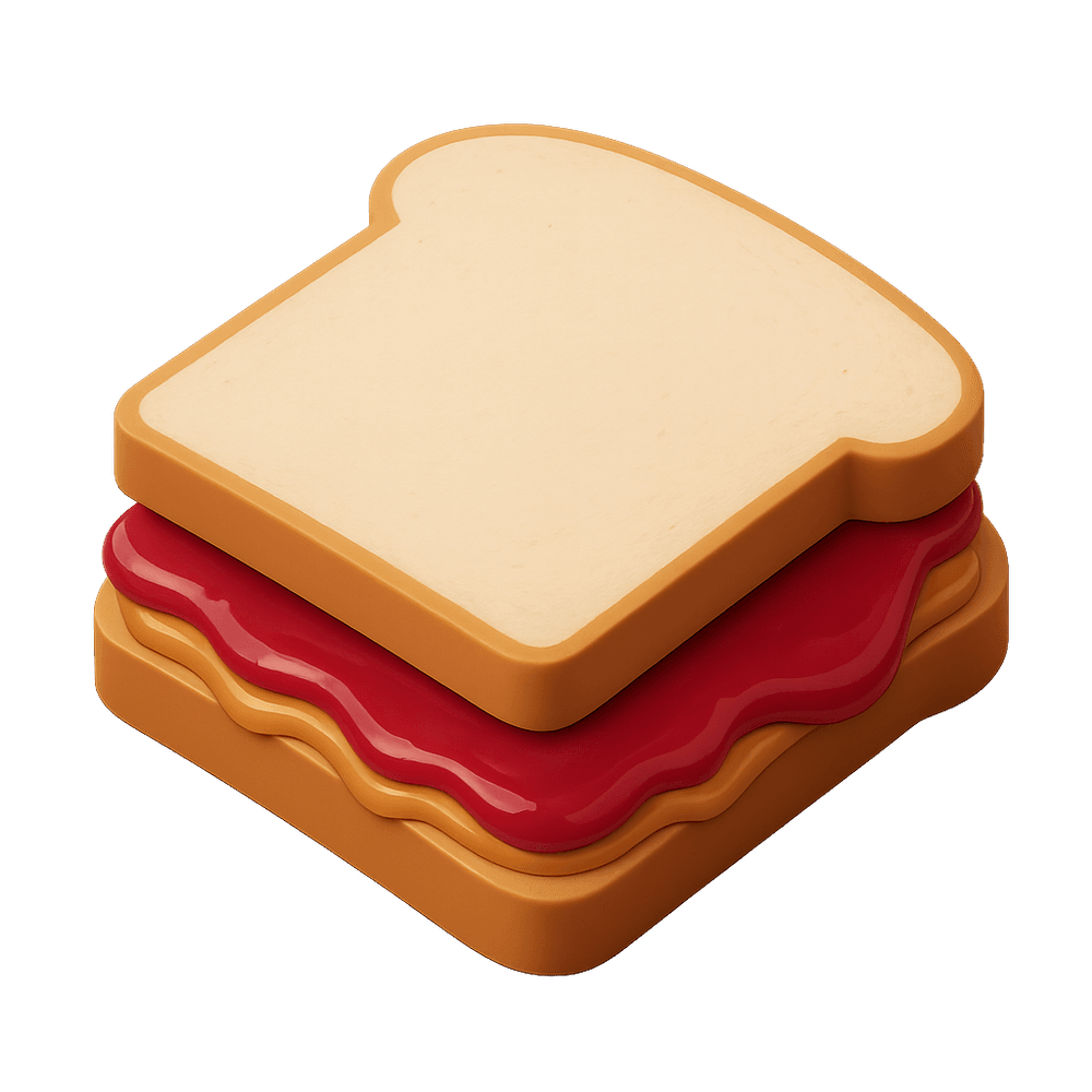 A classic sandwich made by spreading peanut butter and jelly between two slices of bread. Popular as a quick, easy, and satisfying meal or snack, especially in North America.