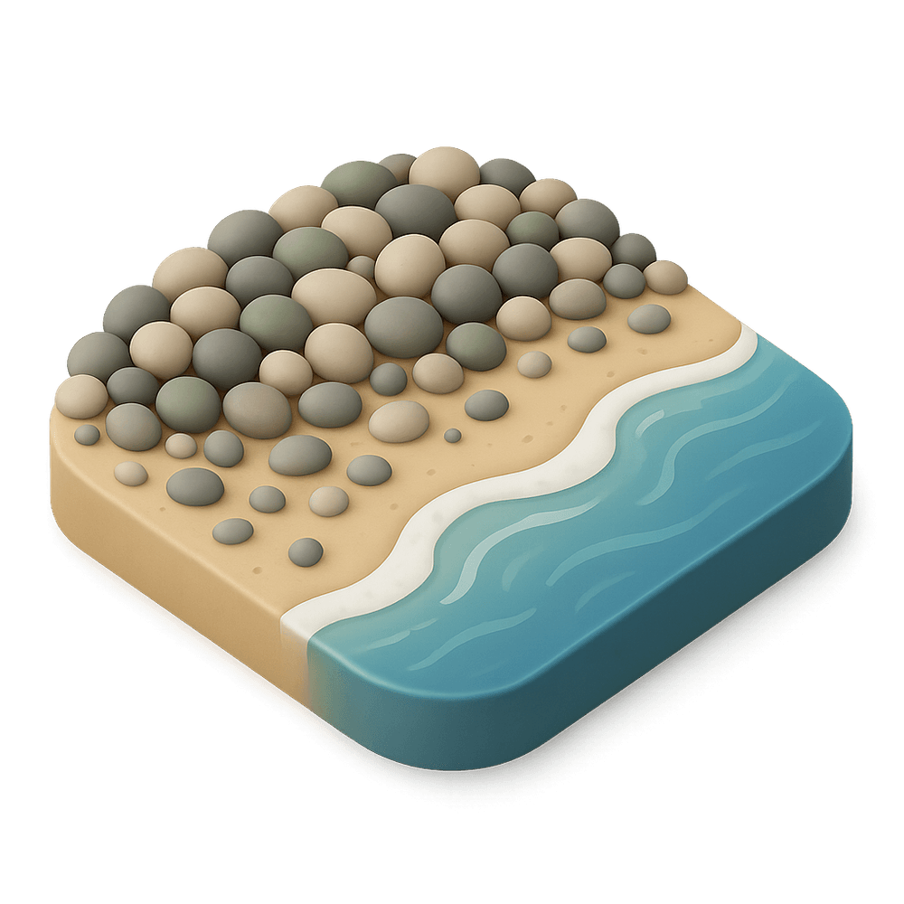 A pebble beach is a shoreline covered with smooth, rounded stones instead of sand. These beaches are shaped by the action of waves and tides, creating a unique natural landscape often found along coasts and lakeshores.