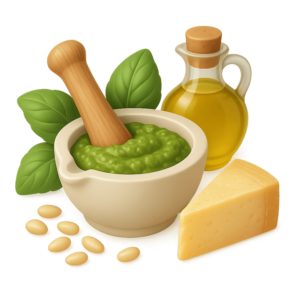 Pesto is a classic Italian sauce made primarily from fresh basil, garlic, pine nuts, Parmesan cheese, and olive oil. It is commonly used as a condiment for pasta, sandwiches, and various dishes, offering a rich, herbal flavor.