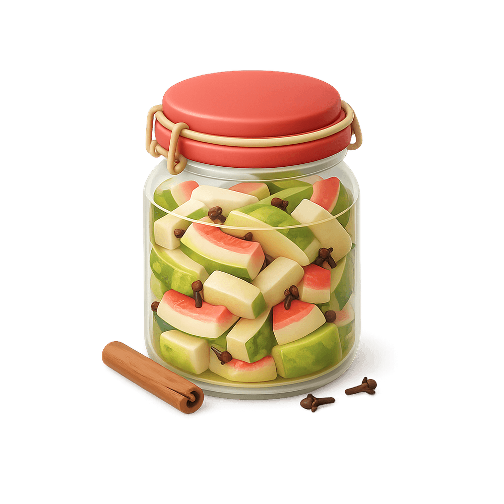 Pickled Watermelon Rind is a sweet and tangy preserved food made from the rind of watermelon, typically brined with vinegar, sugar, and spices. It is often enjoyed as a unique snack, condiment, or side dish, especially in Southern cuisine.